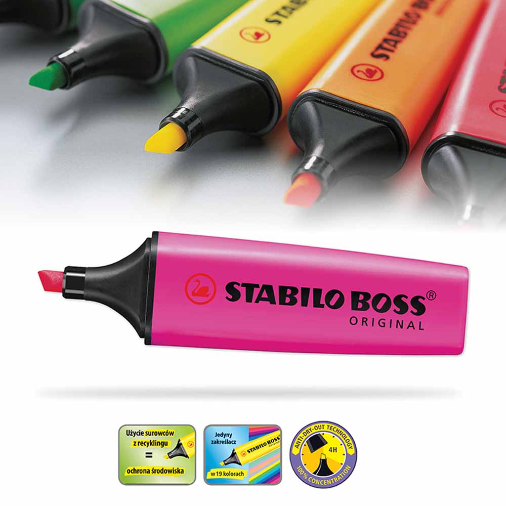 Zakreślacz STABILO BOSS ORIGINAL to legenda wśród zakreślaczy, ciesząca się niesłabnącą popularnością od ponad pięciu dekad. Dostępny w imponującej palecie 30 kolorów, umożliwia tworzenie barwnych, wyrazistych notatek.