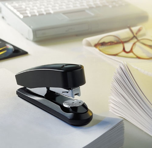 - zszywacz biurowy z systemem bardzo płaskiego zakleszczania zszywek (Flat-Clinch) co pozwala na umieszczenie w segregatorze nawet 30% więcej zszytych dokumentów w porównaniu z dokumentami zszywanymi standardowo