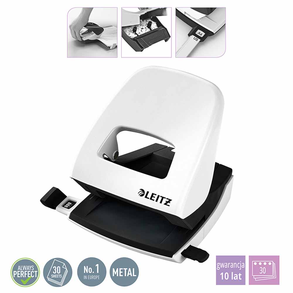 Dziurkacz jest wyposażony w plastikowy pojemnik na konfetti, który ułatwia utrzymanie porządku na biurku. Posiada także praktyczną listwę formatową, która umożliwia precyzyjne dziurkowanie dokumentów w formatach A4, US, A5, A6 oraz 888. Boczne elementy dekoracyjne dodają estetyki, dzięki czemu dziurkacz prezentuje się elegancko w każdym biurze.