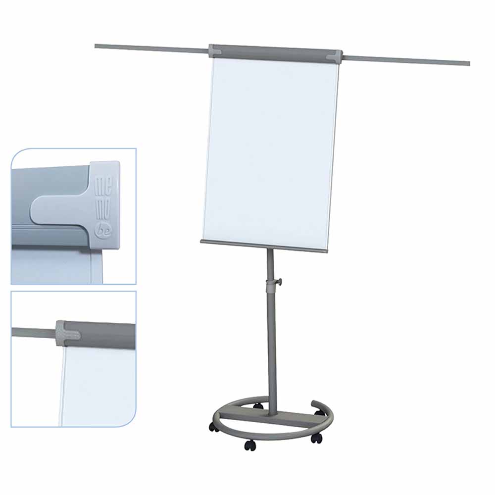 Flipchart BI-OFFICE posiada praktyczną plastikową półkę, na której można przechowywać markery, gąbki oraz magnesy. Wszystkie niezbędne akcesoria są w zasięgu ręki, co ułatwia prowadzenie prezentacji i utrzymanie porządku.