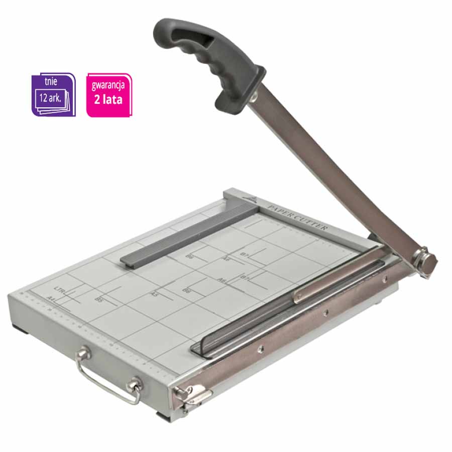 Blat roboczy gilotyny wyposażony jest w antypoślizgową podstawę, co gwarantuje stabilność podczas pracy. Plastikowa osłona zabezpieczająca oraz ergonomiczny uchwyt dodatkowo zwiększają komfort i bezpieczeństwo użytkowania, minimalizując ryzyko przypadkowego skaleczenia.