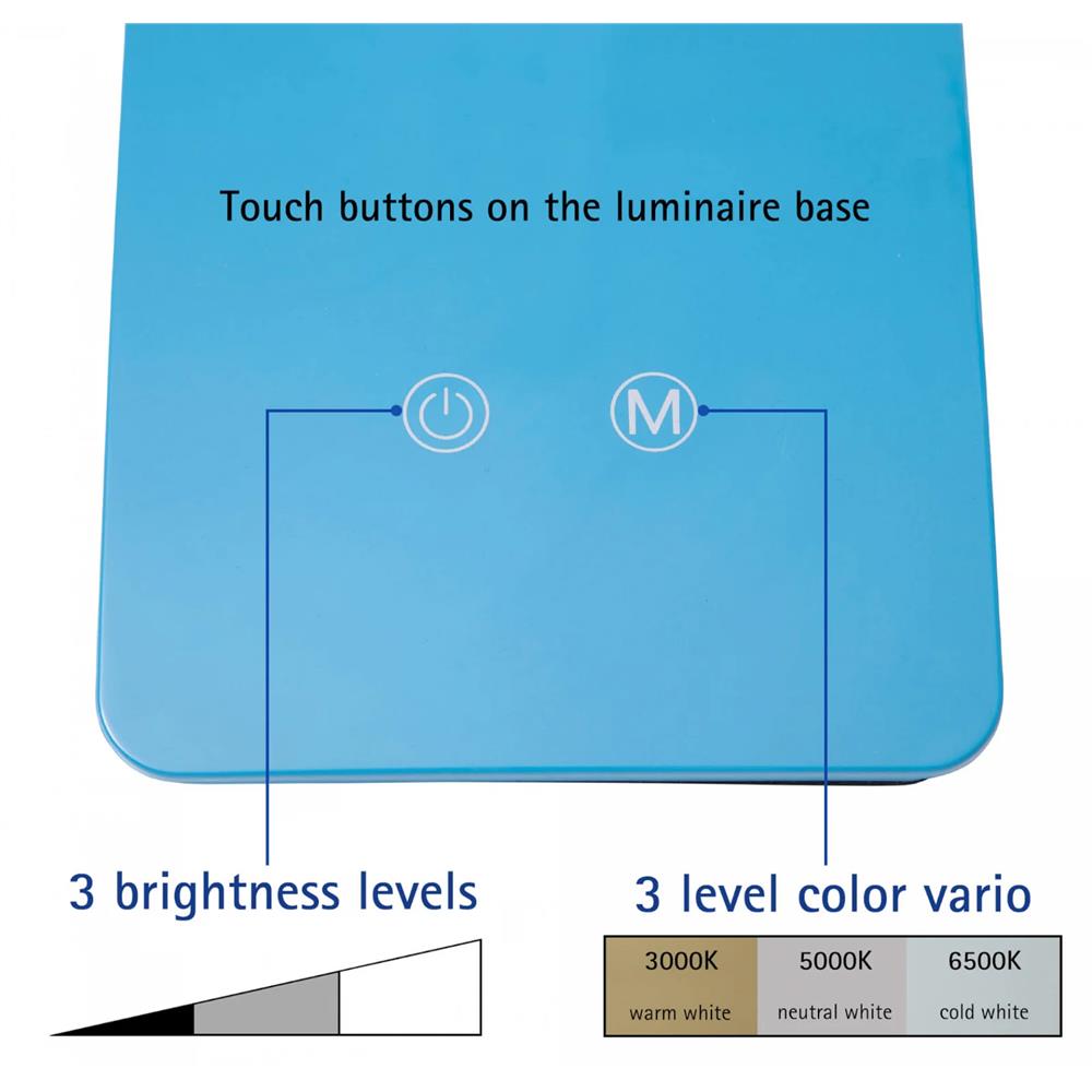 - posiada funkcję regulacji poziomu barwy światła na 3 poziomach i jego natężenia również na 3 poziomach za pomocą dotykowego sterownika