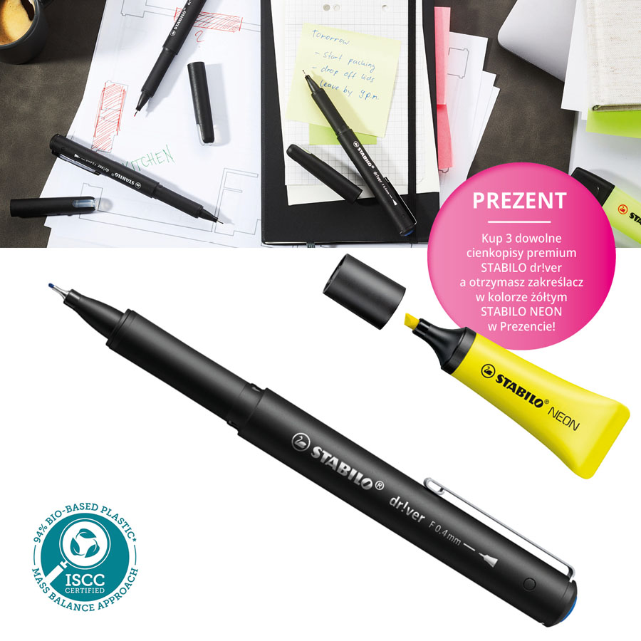 kup 3 dowolne cienkopisy premium STABILO dr!ver a otrzymasz zakreślacz w kolorze żółtym STABILO NEON w Prezencie !