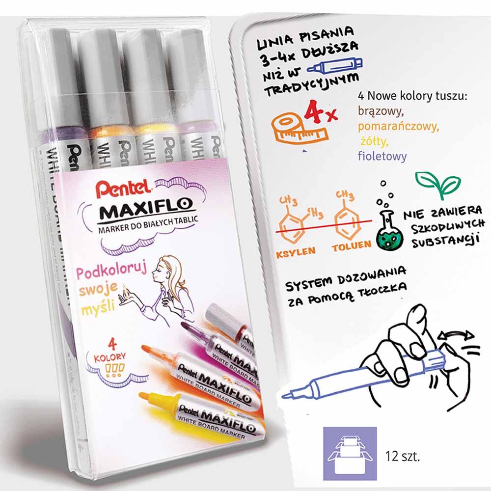 Wyraźne kolory tuszu i łatwość ścierania sprawiają, że marker Pentel MWL5M Maxiflo jest idealnym narzędziem do codziennego użytku na tablicach suchościeralnych.