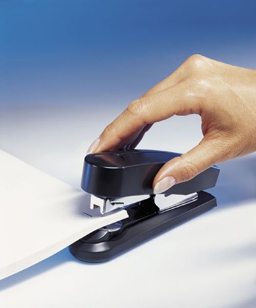- zszywacz biurowy z systemem bardzo płaskiego zakleszczania zszywek (Flat-Clinch) co pozwala na umieszczenie w segregatorze nawet 30% więcej zszytych dokumentów w porównaniu z dokumentami zszywanymi standardowo