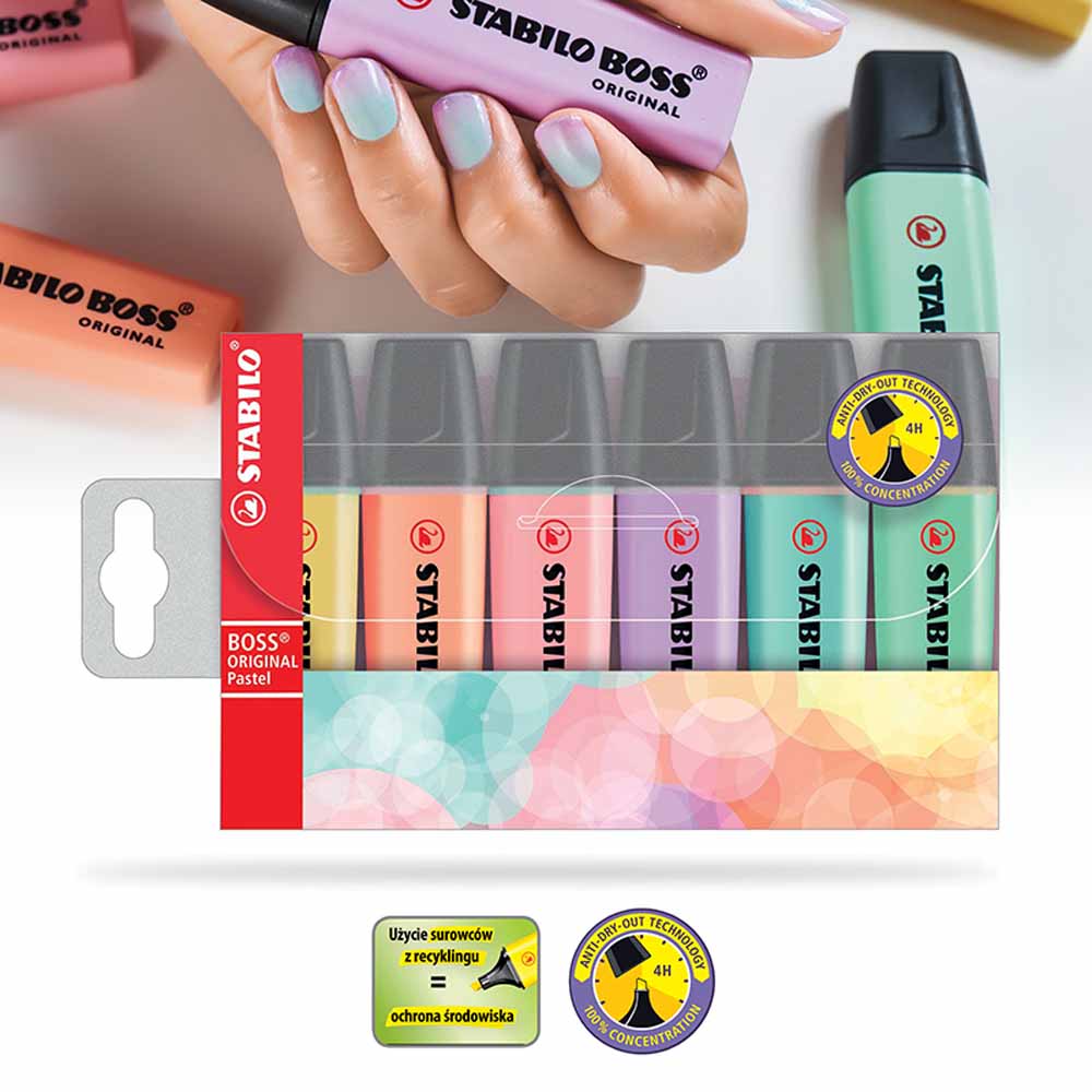 - w trosce o środowisko wszystkie czarne elementy zakreślacza wykonane są z plastiku pochodzącego z recyklingu
