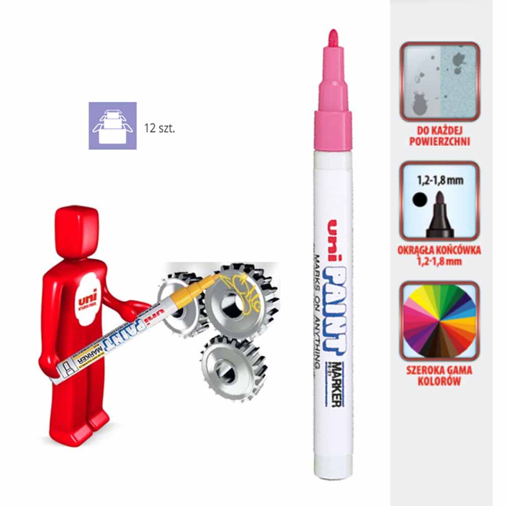 Marker wyposażony jest w okrągłą fibrową końcówkę, która zapewnia równomierne i precyzyjne oznaczenia. Końcówka pompująca pozwala na płynne pisanie, eliminując przerwy w pracy i gwarantując komfort użytkowania.